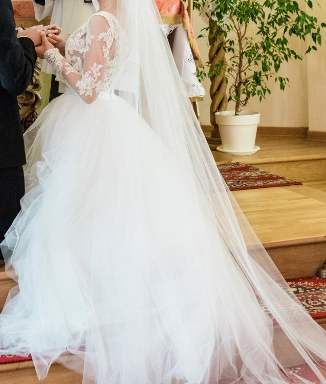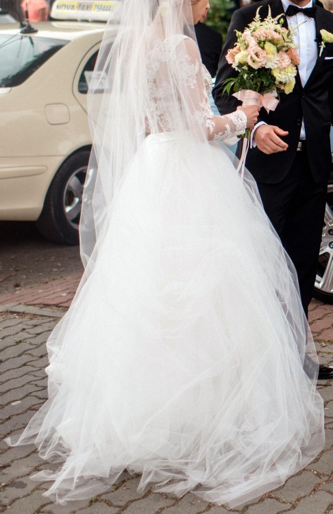 Suknia koloru off-white, góra z ręcznie wyszywanej pięknej, prześwitującej koronki, dół sukni wielowarstwowy z wysokiej jakości, nieregularnie ciętego tiulu (jak na zdjęciach). Zapinana na niewidoczny suwak.