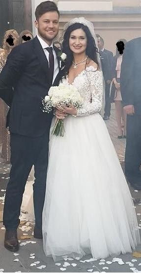 Suknia obecnie znajduje się w moim domu rodzinnym w Leżajsku, zawsze można przyjechać ją sobie przymierzyć. Wykorzystana jest hiszpańska koronka na górną część sukni oraz rękawy. Na górze jest siateczka w ciałowym kolorze, która pozwala dobrze utrzymać koronce, na ramionach jest efekt opadającej koronki, czyli ramiona są odsłonięte, najlepiej to widać, jeżeli fryzura byłaby upięta do ślubu, tył jest również odkryty do połowy i ma eleganckie guziczki.