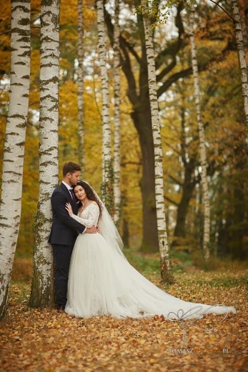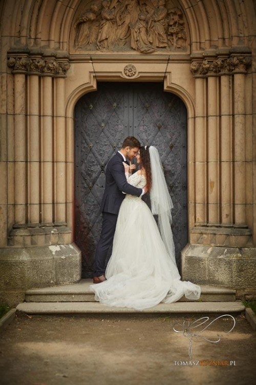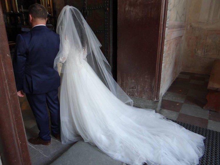 Suknia obecnie znajduje się w moim domu rodzinnym w Leżajsku, zawsze można przyjechać ją sobie przymierzyć. Wykorzystana jest hiszpańska koronka na górną część sukni oraz rękawy. Na górze jest siateczka w ciałowym kolorze, która pozwala dobrze utrzymać koronce, na ramionach jest efekt opadającej koronki, czyli ramiona są odsłonięte, najlepiej to widać, jeżeli fryzura byłaby upięta do ślubu, tył jest również odkryty do połowy i ma eleganckie guziczki.