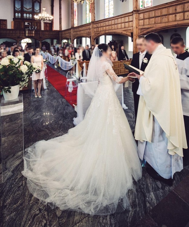 Suknia jest długa do ziemi i posiada efektowny tren, nadający jej niepowtarzalnego uroku. Mimo imponujących rozmiarów można go łatwo podpiąć.
