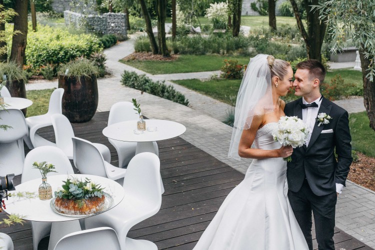 Suknia uszyta z materiału mikado (mieszanka różnych gatunków jedwabiu) w kolorze ivory.