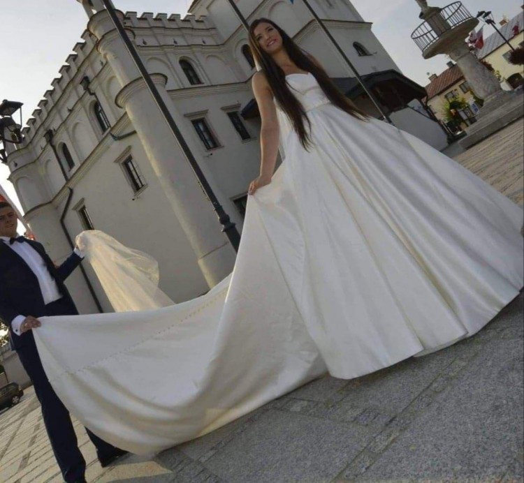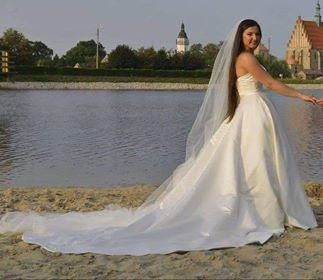 Wyjątkowa suknia ślubna wykonana z gładkiej satyny w zestawie z 5 metrowym welonem. Szyta na wzrost 174+11 cm obcas, rozmiar 38.