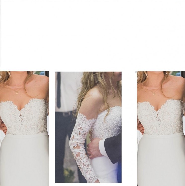 Gdy zobaczysz suknie jak te, zakochasz się w nich od pierwszego wejrzenia. Suknia ślubna o kroju syreny, z dopasowaną talią i spódnicą z trenem z krepy oraz tiulu zachwyca zmysłowym gorsetem z koronki i gipiury z prześwitującym dekoltem, zarówno z przodu, jak i z tyłu. Gorset zlewa się ze skórą, tworząc piękny efekt tatuażu. Długi rękaw z odkrytymi ramionami podkreśla kobiecość, sprawiając, że panna młoda wygląda olśniewająco.