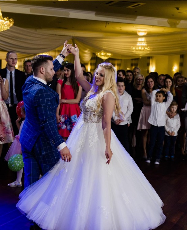 Sprzedam przepiękną suknię z hiszpańskiego domu mody Pronovias. Kolekcja z roku 2017, model Ofelia. Suknia została zakupiona w szczecińskim salonie sukien ślubnych Novia. Krój księżniczki, dół wykonany jest z wysokiej jakości miękkiego niegniotącego się tiulu, góra to niewidoczna siateczka, na której widnieje nierównomiernie rozłożona biało cielista koronka, głęboko wycięte plecy. Suknia posiada cielistą bluzeczkę z fiszbinami, jest zapinana na guziczki. Rozmiar według producenta to 36, jednak myślę, że jest on bardziej zbliżony do rozmiaru 38, szyta na wzrost 164 cm+ 8,5 cm obcas. Suknia robi ogromne wrażenia a do tego jest niezwykle wygodna, lekka i prosta do założenia :)