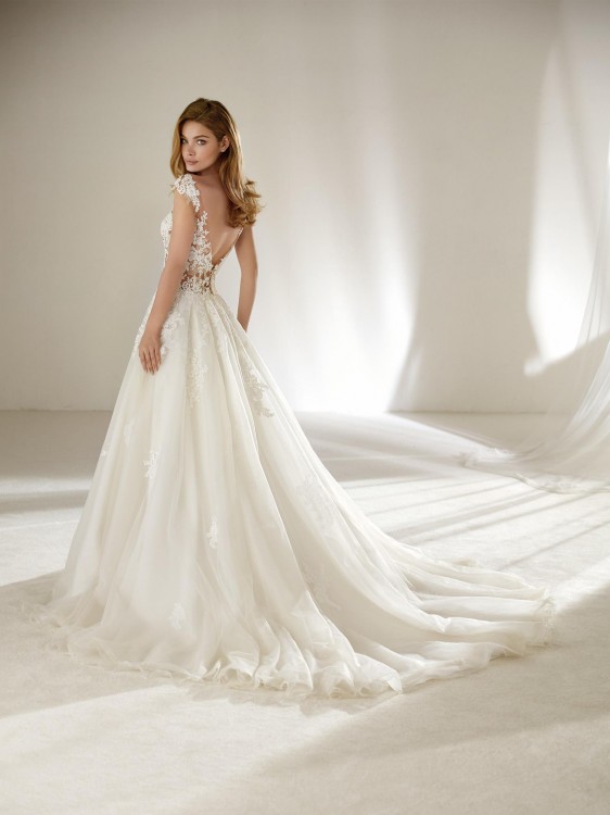 Zmysłowa balowa suknia ślubna, w której największą uwagę zwracają tiul i haftowane akcenty kwiatowe. Cudowny fason, który doskonale wykorzystuje objętość; połączenie spódnicy uszytej z warstw tiulu z prześwitującym stanikiem z minirękawkami z haftowanego przejrzystego tiulu