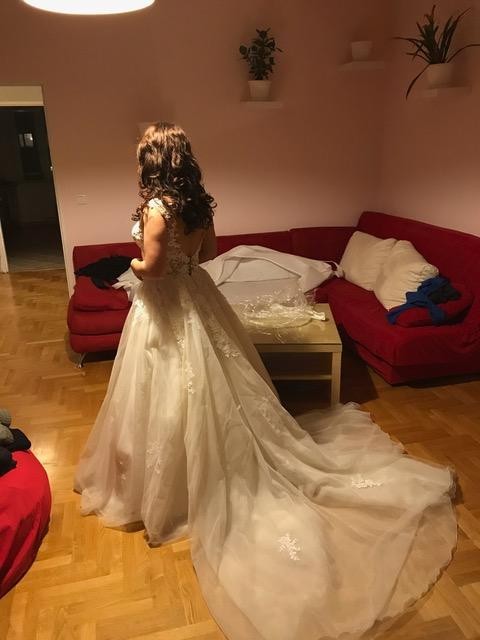 W zestawie koło i diadem złoty z kryształkami. Suknia posiada piękny tren, który można podpiąć za pomocą pętelek i dopasowanych guziczków. Suknia ma jedną warstwę ciemniejszegoo tiulu, który sprawia że wygląda na kolor ecru.