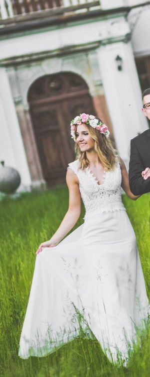 Gipiura i szyfon, imponujące połączenie. Suknia ślubna w stylu boho, z delikatnym stanikiem z dekoltem w szpic, szerokimi ramiączkami i głębokim wycięciem w szpic na plecach. Sukienka sprawia wrażenie dwuczęściowej dzięki połączeniu przeźroczystego materiału i powiewnego szyfonu, który sprawia, że rozszerzana spódnica jest bardzo powiewna.