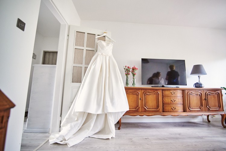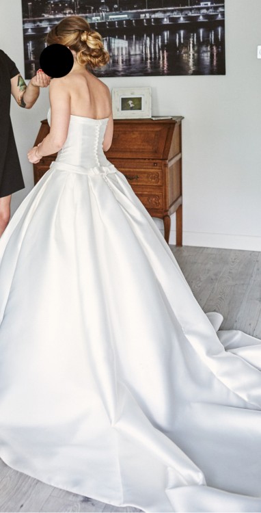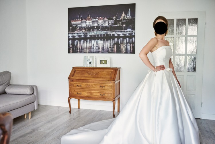 Suknia jest wykonana z jedwabiu Mikado. Ma podczepiany, długi tren. Jest ponadczasowa, klasyczna, prosta i przyciągająca wzrok. Krój to księżniczka z obniżonym stanem. Rozmiar: 38 zmniejszone na 36, (biust 65F - 88 cm, talia 64 cm). Dopasowana do wzrostu 163 cm + 8 cm wys. szpilki.
