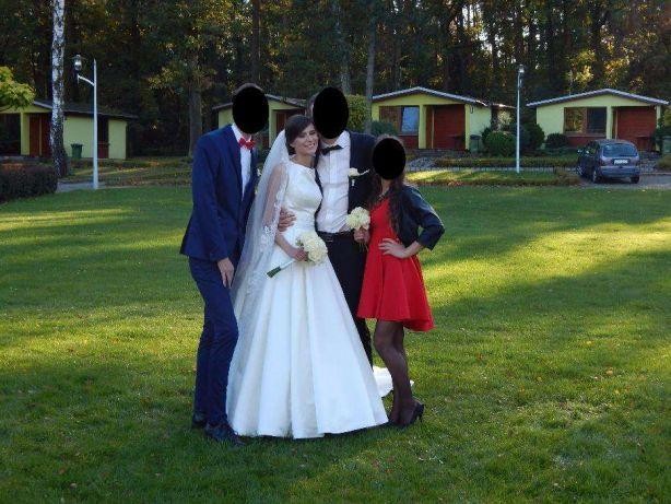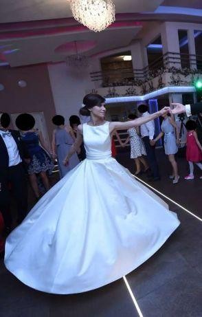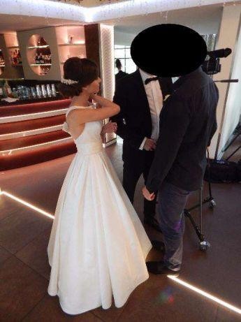 Suknia w kolorze ivory w całości wykonana z gładkiej satyny. Posiada długi tren, który po podpięciu jest niewidoczny. Suknia jest bardzo wygodna, posiada kieszenie, a podpięty tren nie sprawia żadnych problemów.