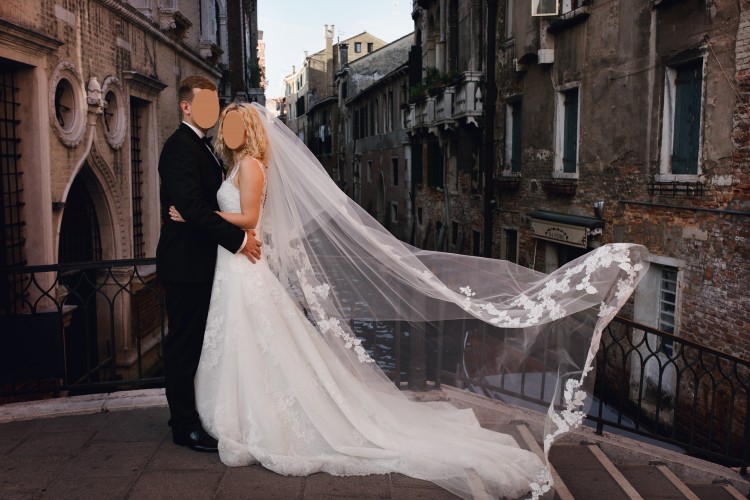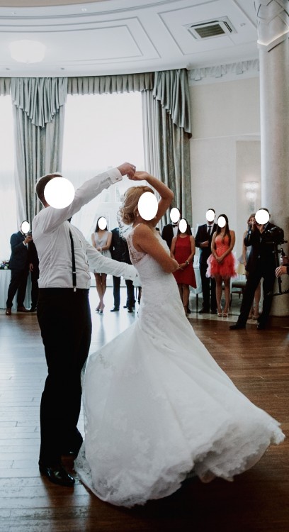 Istnieje możliwość odpięcia bolerka i odsłonięcia ramion. Suknia posiada przepiękny długi tren, który po podpięciu idealnie komponuje się z suknią i nie krępuje ruchów. Suknia zrobiła niesamowite wrażenie na moim mężu i gościach.