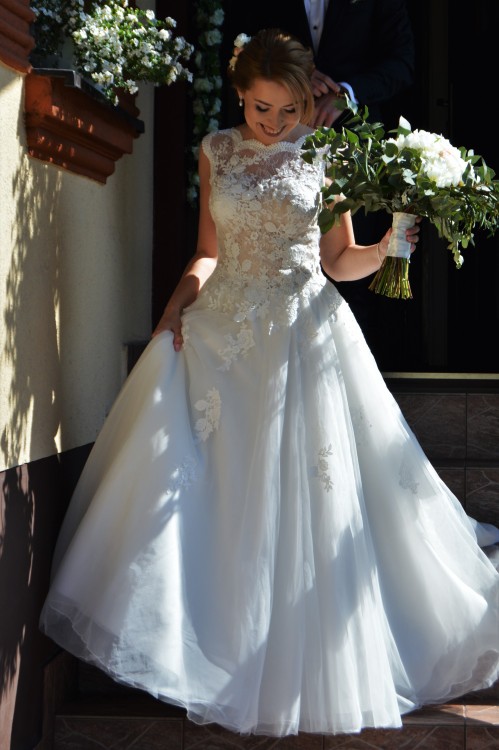 Sprzedam zjawiskową suknię renomowanej hiszpańskiej marki Pronovias, model Tamira 2016. Rozmiar 36, na wzrost 165cm + 6,5cm obcas. Góra wykonana jest z przepięknej koronki, dół z delikatnego tiulu. Suknia posiada podpinany tren oraz pasek na haczyki dopasowany do obwodu talii. Kolor Ivory. Cena salonowa 6700 zł. Suknia zakupiona w salonie Caroline Novia w Krakowie. Bardzo wygodna, idealna do tańca. Suknia jest wyczyszczona, w stanie bardzo dobrym. Możliwość obejrzenia i przymiarki w Katowicach.