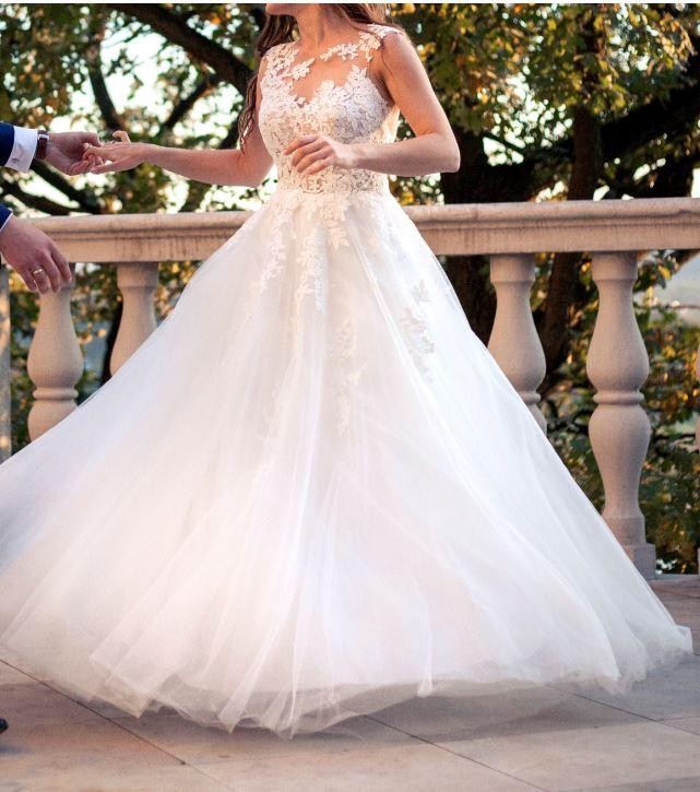 Sprzedam suknię ślubną hiszpańskiej marki Pronovias- model FELICIDAD. Dół sukni składa się z wielu warstw tiulu, dzięki czemu pięknie się układa, przy czym jest lekka i zwiewna. Górna część sukni to cielisty tiul, na którym naszyta jest przepiękna koronka. Suknia posiada gorset, który można wypiąć.