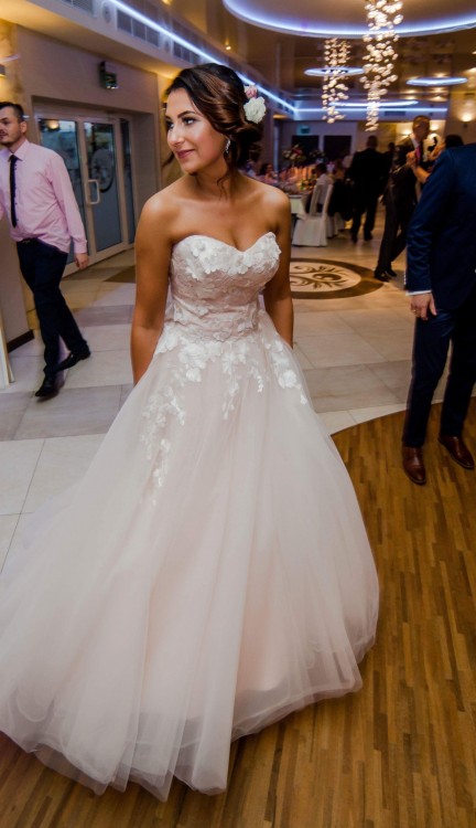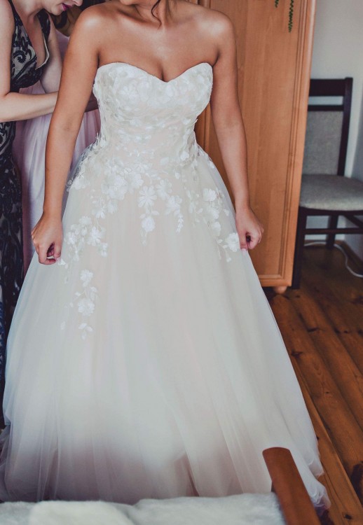 Suknia ślubna w kolorze pudrowego różu. Aplikacja 3D w kolorze ecru