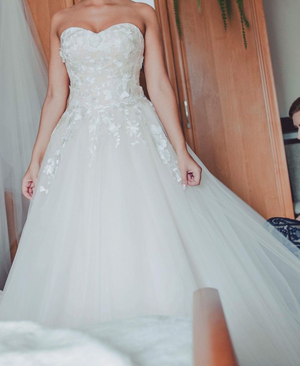 Sprzedam piękną i wyjątkową suknie ślubną w kolorze delikatnego pudrowego różu. Suknia ma naszytą koronkę 3D w kolorze ecru. Suknia kupiona była w salonie Bellisima w Częstochowie za kwotę 3800 zł . Suknia została wyczyszczona po sesji w plenerze. Rozmiar 38, na 165 plus ok 7-8 cm obcas. Sukienka jest z tylu regulowana gorsetem- wiązana, a na wiązaniu ma jeszcze suwak także pięknie można ją dopasować do sylwetki