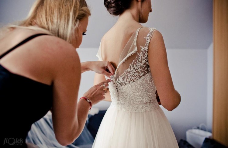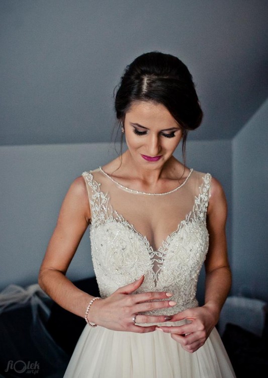 • Góra - na bezbarwnej siatce naszyta jest aplikacja wyszyta kamieniami Swarovskiego. Do sukni wszyte są miseczki - nie ma potrzeby zakładania biustonosza.