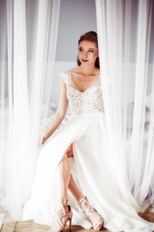 Góra natomiast to aplikacje z koronki z koralikami na cielistej siateczce. Podbicie jest w kolorze cielistym. Głęboki dekolt z tyłu w kształcie litery V. Delikatne rękawki - również na siateczce przyszyte aplikacje imitujące rękawek w stylu "motylka". Suknia z tyłu zapinana jest na nierzucający się w oczy zamek.