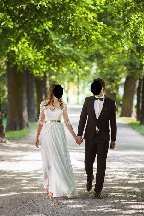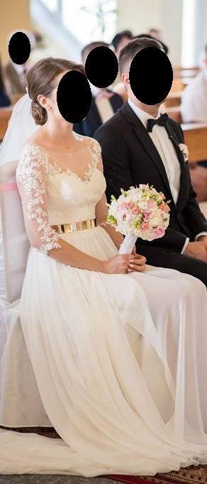 Mam do sprzedania śliczną i niepowtarzalną suknię ślubną w kolorze śmietankowym. Suknia szyta według mojego projektu, wzrost 170 cm + 6 cm obcas, rozmiar 34.