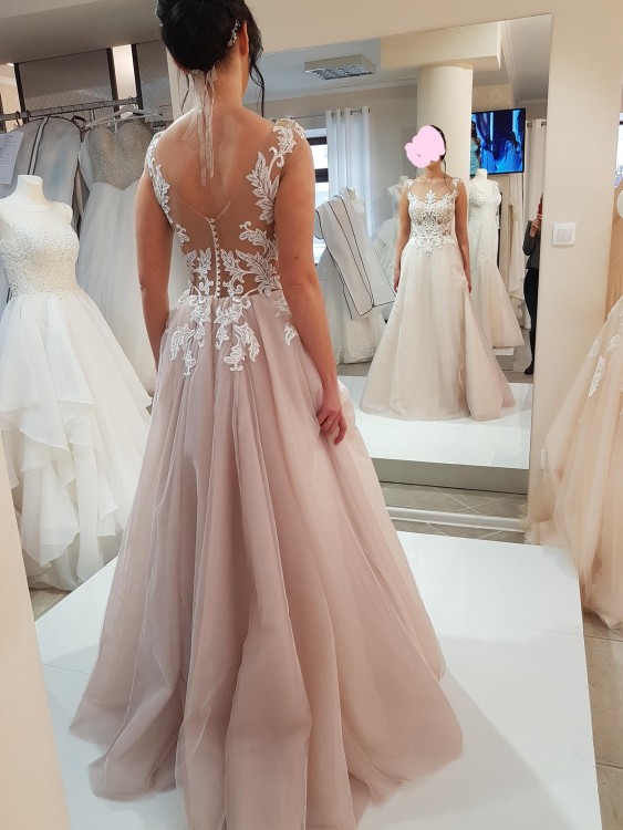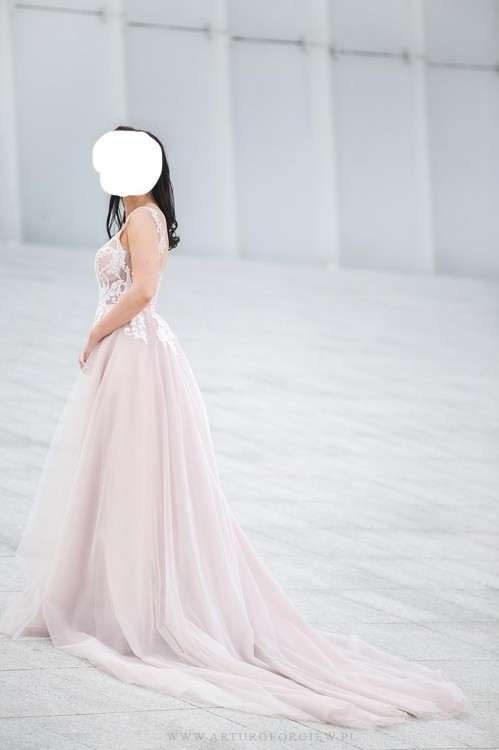Dół sukni – tiul biały oraz różowy, dzięki czemu suknia ma niepowtarzalny kolor.
