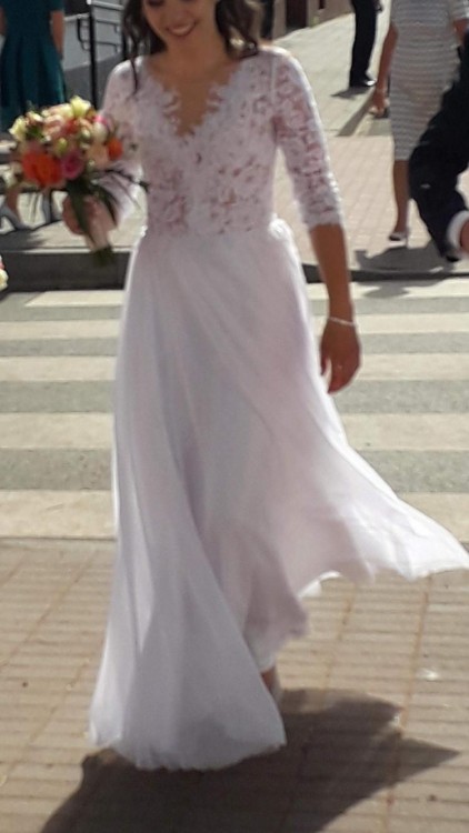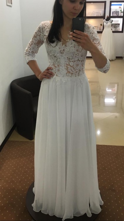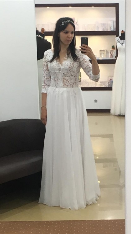 Suknia lekka, zwiewna, wykonana z wysokiej jakości materiałów, bez koła, świetnie układa się w ruchu i podczas tańca - bardzo wygodna, nie krępuje ruchów. W sukni zostały wszyte szlufki, które gwarantują utrzymanie ramiączek i stanika na swoim miejscu.