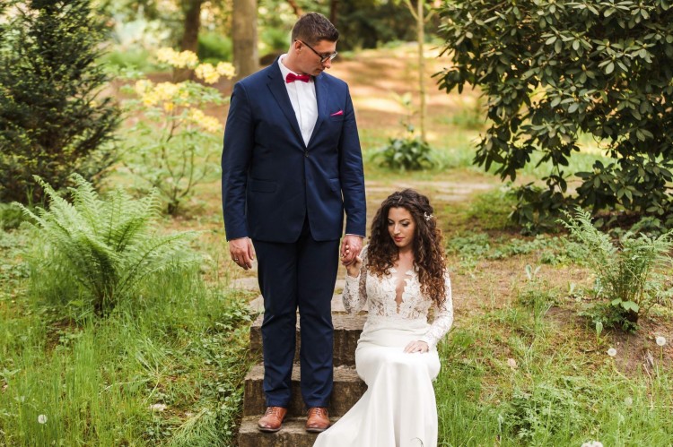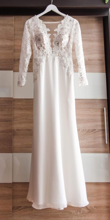 Suknia w kolorze śmietankowej bieli, szyta na wzrost 165 cm + 7 cm obcas. Posiada wszyte miseczki w rozmiarze C (w kolorze cielistym), jednak bez problemu można je wypruć i wszyć inny rozmiar. Na plecach dekolt w kształcie litery V. Bardzo lekka i wygodna, nie krępuje ruchów. Po ślubie i sesji zdjęciowej została wyczyszczona i w takim stanie czeka na nową włascielkę.