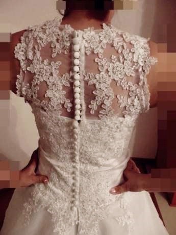 Tył również z koronką, zapinany na zamek i guziczki.