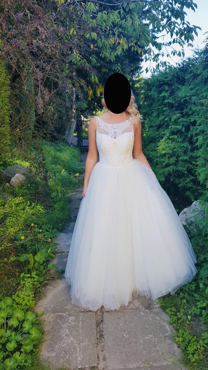 W pierwotnej wersji sukni, tył był wiązany, gorsetowy. Została ona uszyta bez wiązanego tyłu, aby pięknie podkreślić plecy ( odkryte w literę V ). Dekolt w łódkę z przepiękną koronką i perełkami. Przód usztywniany. Suknia klasyczna w kształcie litery A. Z tyłu zapinana na kryty suwak. Kolor śmietankowy. Dół z delikatnego tiulu. Rozmiar 36. Uszyta na wzrost zrost 171 cm + 8cm szpilka. Suknia wyprana w pralni chemicznej, ubrana tylko do kościoła. Nie posiada wad ani zabrudzeń. Stan oceniam na bardzo dobry. Serdecznie zachęcam do przymiarek.