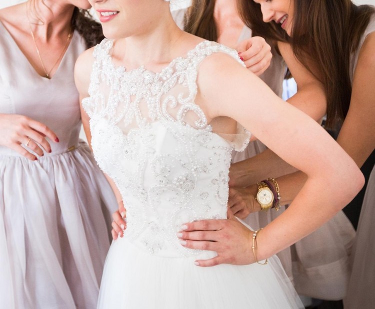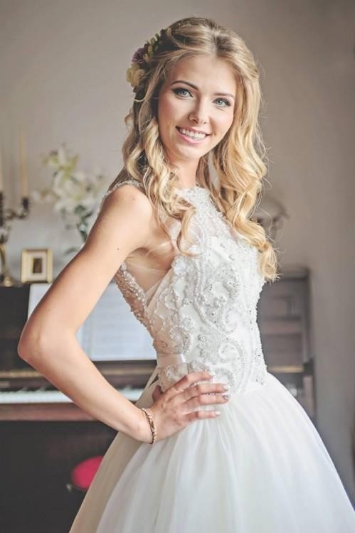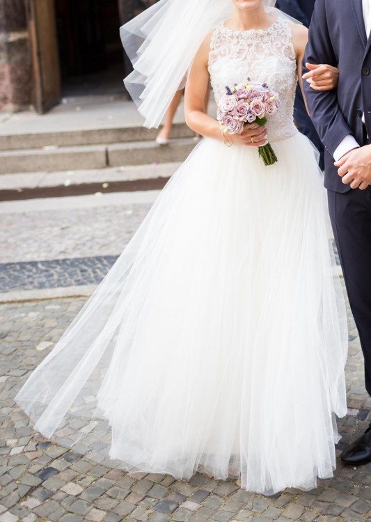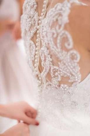 Góra sukienki jest ręcznie wyszywana z perełek i diamencików w piękne wzory ,robi ogromne wrażenie. Sukienka posiada wszyty gorset dzięki czemu nie ma konieczności zakładania biustonosza, ale oczywiście można go ubrać. Dół sukienki z tiulu, w zależności od tego czy chcemy nadać sukience objętości czy nie można pod sukienkę ubrać halkę, którą mam w komplecie. Sukienka jest niepowtarzalna, szyta na zamówienie. Możecie być pewne, że nikt nie będzie miał takiej samej.