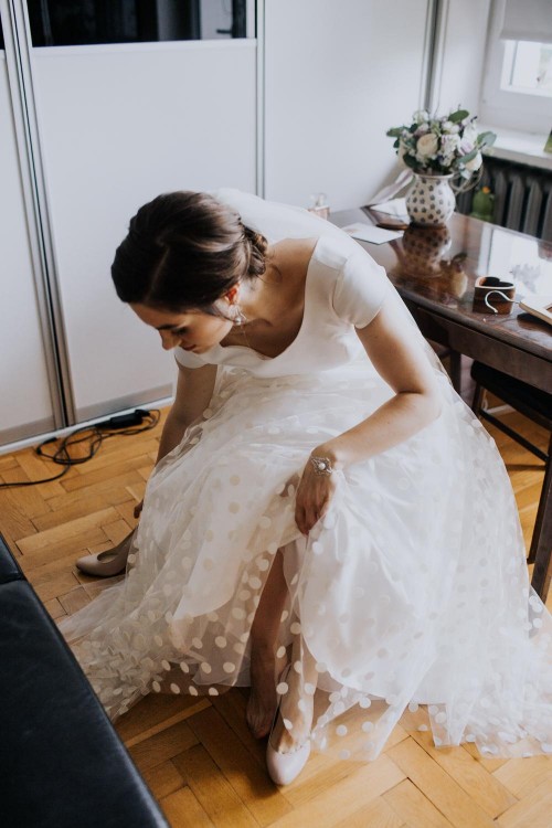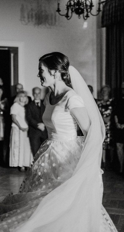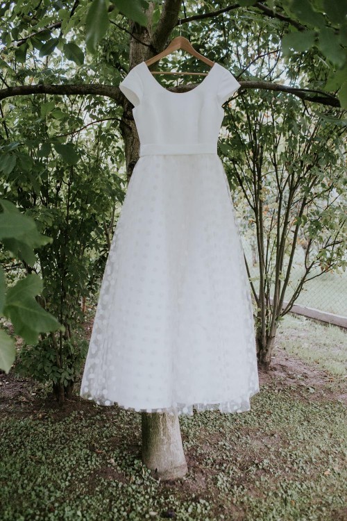 Używana (jestem pierwszą właścicielką) suknia ślubna w retro stylu w groszki. Suknia była użyta w dniu ślubu i wesela(w sierpniu tego roku) oraz na plenerze robionym w innym dniu.