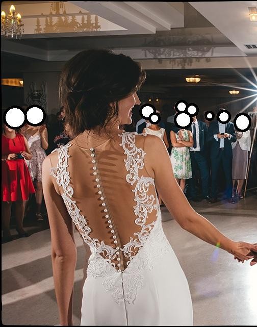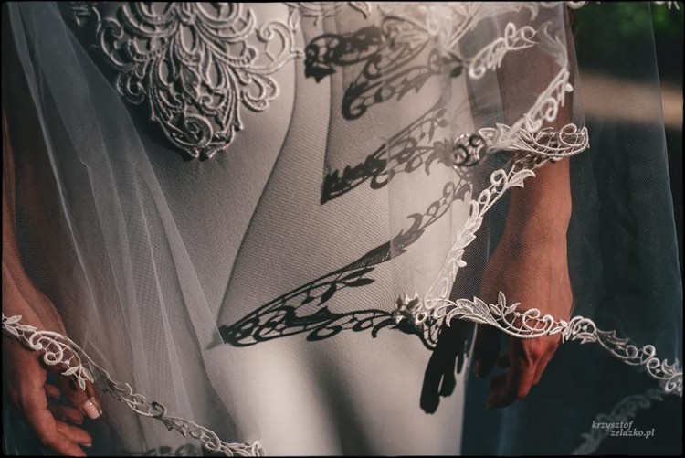 Góra sukienki wykonana została z gipiury osadzonej na cielistej siatce tiulowej dopasowującej się do koloru skóry, co sprawia, że sukienka idealnie przylega do ciała i nie zsuwa się podczas zabawy. Do sukienki wszyte zostały miseczki z push up-em. Głęboki, koronkowy dekolt na plecach podkreśla talię. Zamek sukienki ukryty został pod subtelnymi perełkami. Dół sukienki uszyto z lekkiej, gładkiej tkaniny, która nie krępuje ruchów, długi tren podpinany jest na guziczek.