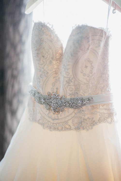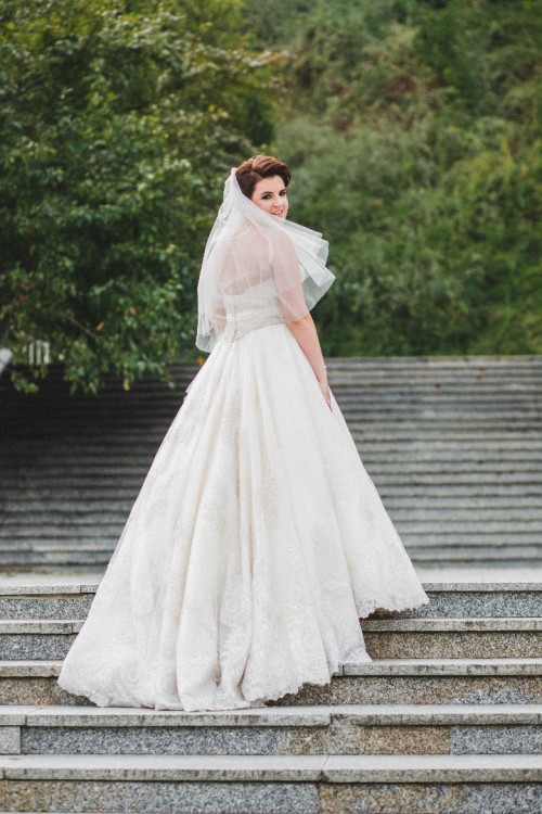 Suknia jest wyjątkowo zdobiona piękną koronką i pasem z kamieniami, dekolt w kształcie serca, plecy wycięte w trójkąt. Pięknie układający się tren - z możliwością podpięcia. Kolor ciepły beż.