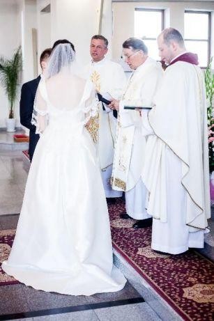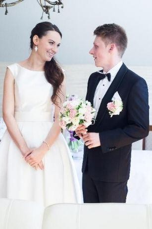 Sprzedam sukienkę ślubną w idealnym stanie, nałożona raz, nie było pleneru. Zakupiona została w Warszawie w salonie Madonna. Ja mam 184cm wzrostu i byłam bez obcasów więc zarówno dla wysokiej jak i niższej osoby będzie pasować. Została uszyta z wysokiej jakości materiałów, sukienka jest w kolorze ecru/kremowym, jest bardzo wygodna, prosta, klasyczna ale bardzo elegancka, welon ozdobiony na końcach koronką. Wszyscy się to sukienką zachwycali bo jest skromna ale robi efekt wow. Polecam :)