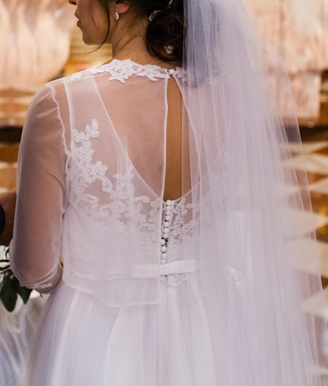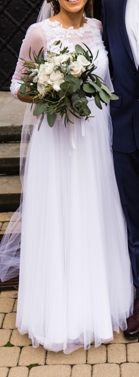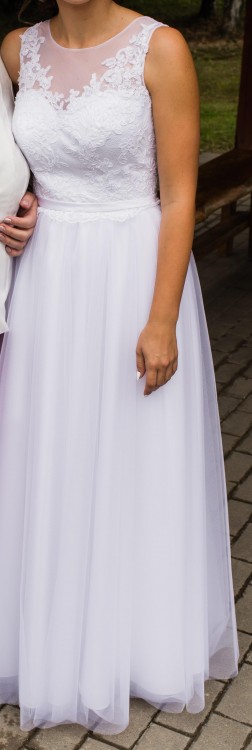 Rozmiar 36, wzrost 164 cm + 9 cm obcas. Góra sukni wykonana jest z siateczki, na której naszyta jest koronka. Tył wycięty w literę V zakończony guziczkami i małą kokarda. Suknia została profesjonalnie wyczyszczona, nie posiada żadnych uszkodzeń. Do sukni dodam halkę z kołem(nie były używane) oraz bolerko- gratis.