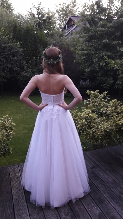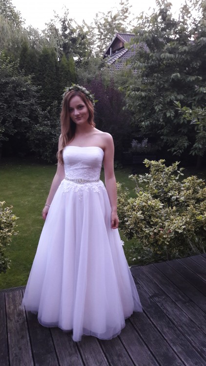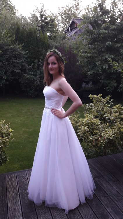 Suknia zakupiona na ślub w czerwcu 2017 r. Jest jednoczęściowa, wykonana w linii-A, wielowarstwowa, z możliwością umieszczenia niewielkiego koła u dołu sukni (bardzo polecam to rozwiązanie, koło w ogóle nie odbija się na materiale i ułatwia chodzenie). Tył sukni opuszczony, odsłaniający plecy. Suknia zdobiona naszytą w talii koronką oraz paskiem srebrnych koralików.