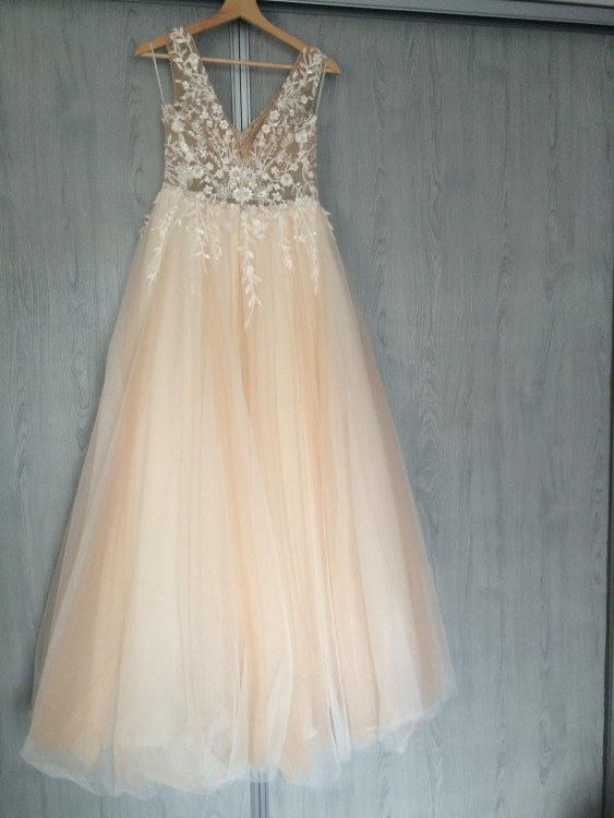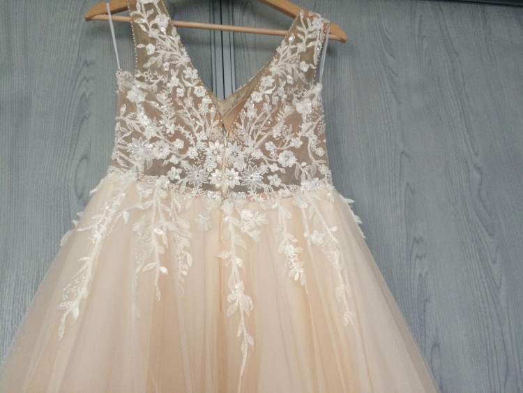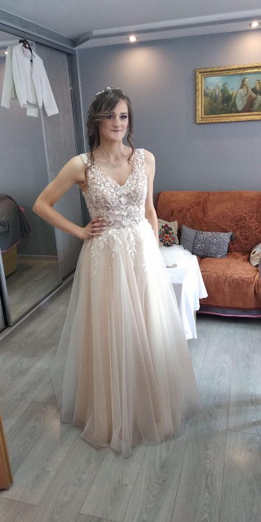 Mam na sprzedaż przepiękną suknie ślubną własnego projektu, co czyni ją jedyną i niepowtarzalną :) Góra sukienki pokryta jest zdobioną koronką, która przechodzi na cześć tiulową sukienki. Koronka naszyta jest na siateczce koloru nude. Dekolt zarówno z przodu jak i z tyłu w literę "V" co optycznie zwęża górną część sylwetki :-) Dół sukienki składa się z 6 warstw miękkiego tiulu z czego jedna (druga od góry) ma barwę ciemno - beżową co daję efekt delikatnych "przejść" na tiulu. Ponad to pod warstwami tiulu jest podszewka + warstwa satyny. Suknia szyta na wzrost 169cm + 7,5cm obcas.