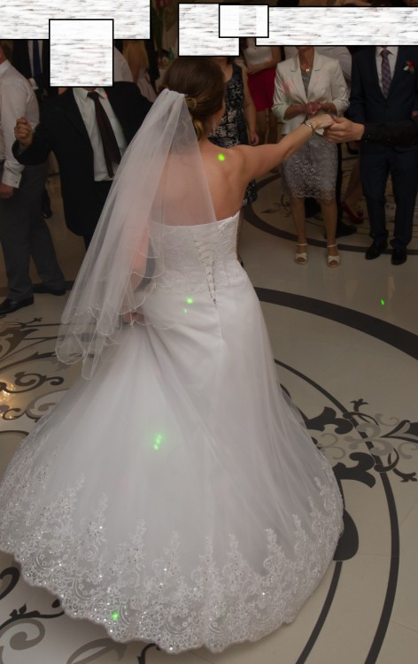 Suknia była szyta na wzrost 165 cm + obcas 7 cm. Ma wszyte koło,