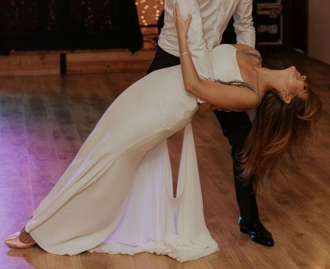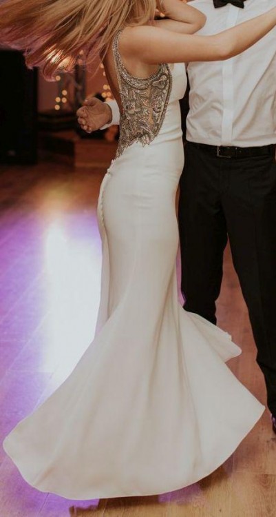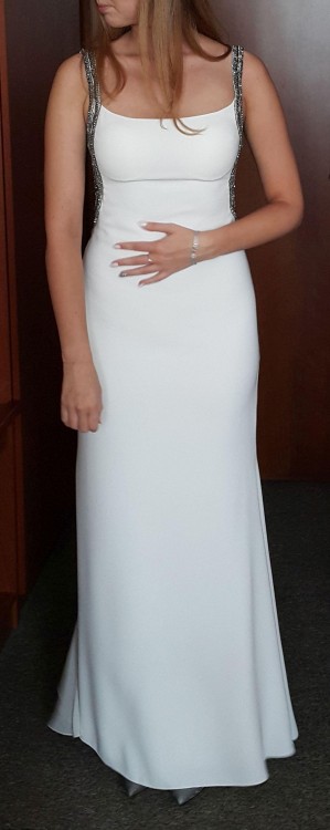 Witam, sprzedam suknię ślubną zaprojektowaną przez Tarika Ediza, zakupioną w Salonie Mody Ślubnej Madonna w Gdyni (cena katalogowa sukni to 4700zł). Rozmiar sukni 38, dopasowany do wzrostu 173 oraz butów na obcasach, kolor écru oraz ozdobne srebrno-szare koraliki. W sukni wszyte są miseczki. Suknia wygląda jak nowa, została założona jeden raz i wyczyszczona profesjonalnie (bez sesji ślubnej, pierwsza właścicielka, oryginalny pokrowiec salonu). Suknia jest bardzo wygodna, nie krępuje ruchów, pięknie dopasowuje się w tańcu, tren można przypiąć tak, aby nie przeszkadzał. Gorąco polecam :)