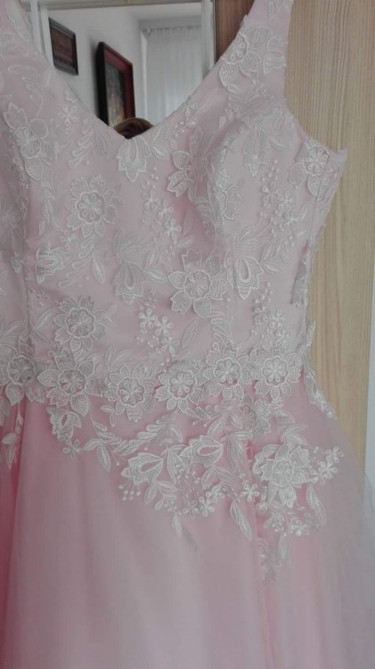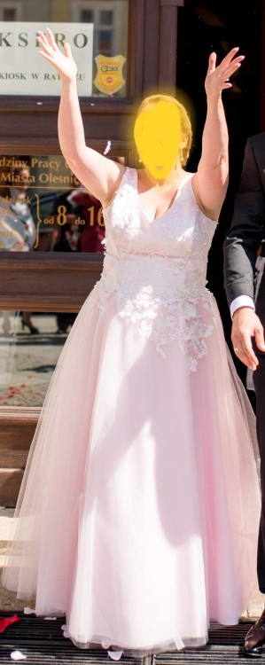 Sprzedam oryginalną suknię ślubną roz.42/44 w kolorze pudrowego różu z białą gipiurą 3D.
