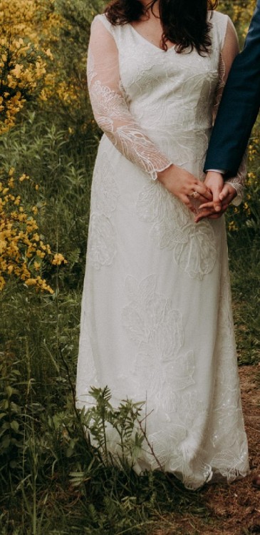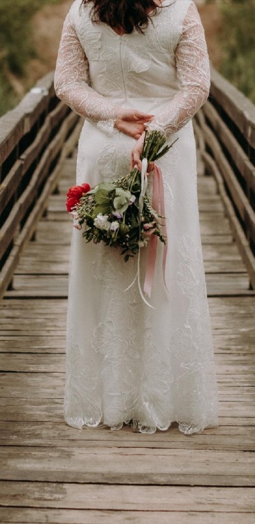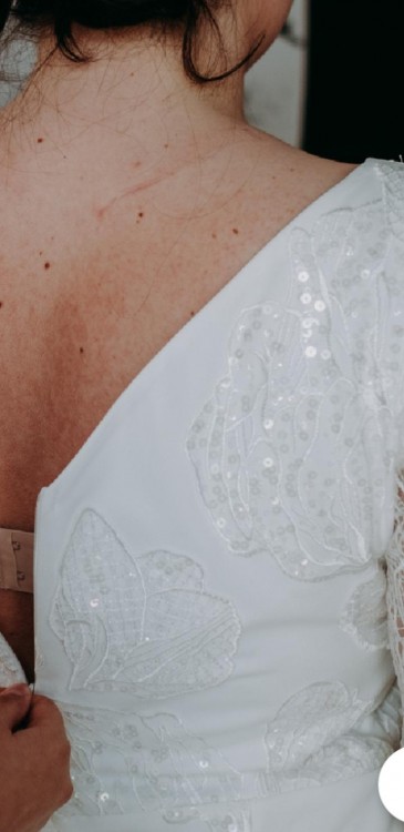 Suknia ma podszewkę i cała jest pokryta koronką, ma wyszczuplający krój - taliowana i puszczona na prosto w biodrach, dekold nie za głęboki w serek. Taki sam dekold na plecach, z tyłu zapinana na ukryty zamek. Koronka bardzo oryginalna z przezroczystymi cekinami w kształcie liści. W razie potrzeby można zmniejszyc sukienkę bez większych problemów. Kolor: złamana biel.