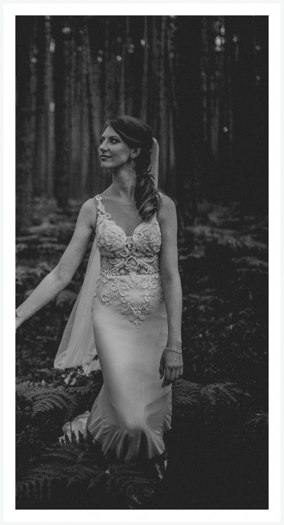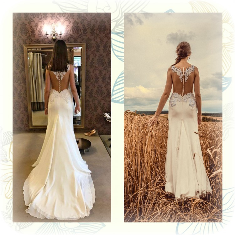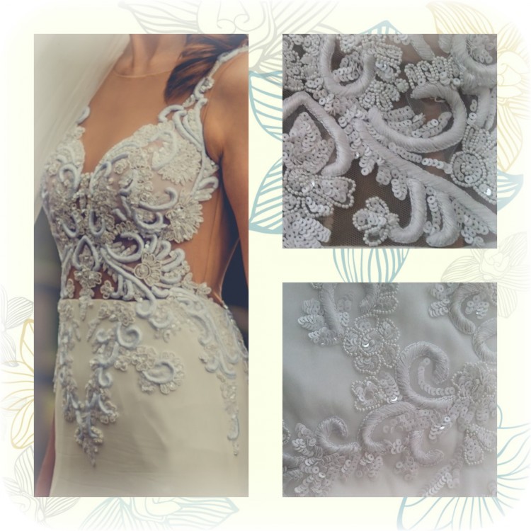 Suknia w kolorze delikatnie kremowej bieli- IVORY. Fason syrenka idealnie podkreśla wszystkie atuty kobiecej sylwetki. Góra sukni wykonana jest z przepięknej, grubej, trójwymiarowej koronki, która robi niesamowite wrażenie na żywo (niestety zdjęcia nie oddają w pełni jej uroku). Koronkowe aplikacje wykończone są delikatnymi cekinami oraz perełkami, które skrzą się w świetle podczas ruchu. Dół z wykonany z muślinu (łącznie 4 warstwy) z trenem, który dodaje sukni hollywoodzkiego szyku. Tren składa się z dwóch warstw muślinu (zdecydowałam o usunięciu dodatkowych dwóch warstw) dzięki czemu po podpięciu bardzo ładnie się układa i nie jest ciężki. Suknia jest lekka i zwiewna, mimo dopasowanego fasonu jest bardzo wygodna i nie krępuje ruchów.