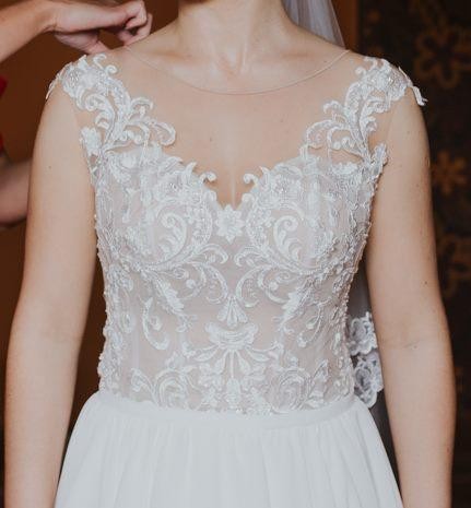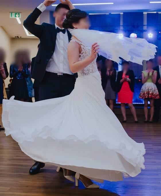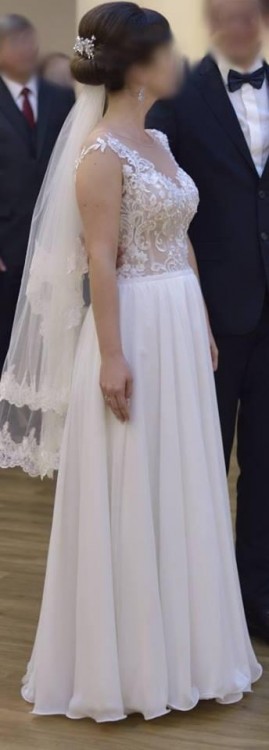 Mam do sprzedania suknię ślubną z kolekcji 2017. Suknia jest w kolorze śmietankowym, została uszyta na miarę (rozmiar 36, wzrost 163cm + 8,5cm obcas – szczegółowe wymiary mogę podać w wiadomości prywatnej). Górę sukni tworzy cielista siateczka z naszytą koronką z błyszczącymi elementami. Dół sukni wykonany z lekkiego i zwiewnego muślinu, który bardzo dobrze układa się podczas każdego ruchu. Bardzo starannie wykonana, bardzo wygodna. Do sukni dołączam delikatne, cienkie bolerko oraz piękny gładki welon obszyty koronką. Suknia jest w bardzo dobrym stanie, została poddana profesjonalnemu czyszczeniu. Suknia do obejrzenia i przymierzenia po uprzednim kontakcie telefonicznym (w Lublinie). Cena 1500zł (do negocjacji).