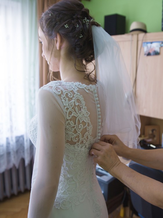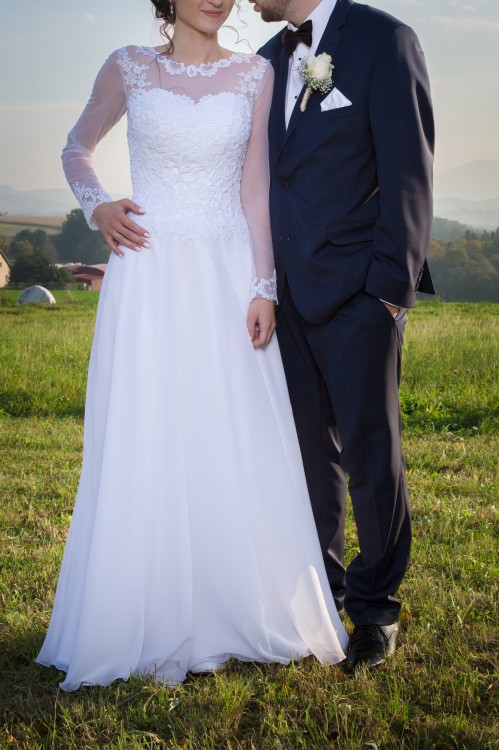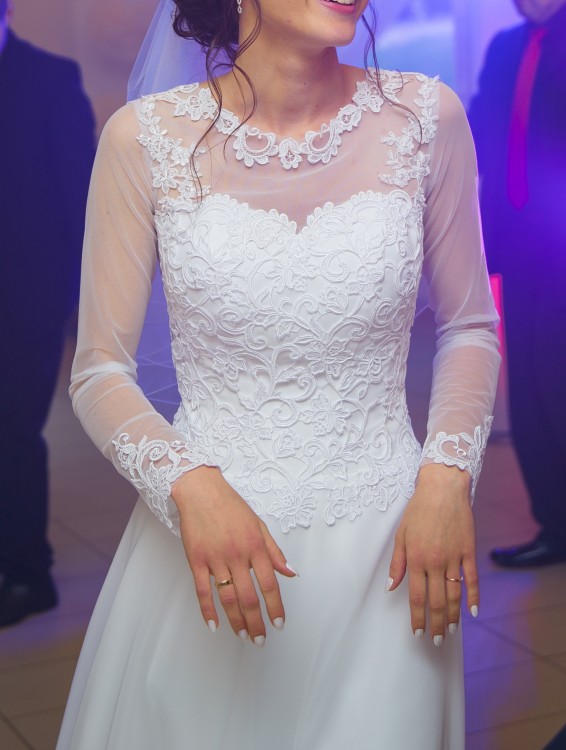 Sprzedam suknię ślubną zakupioną w salonie sukien ślubnych CLASSA w Bielsku Białej. Suknia koloru białego, lekko zmieniona- doszyty rękawek. Suknia ślubna szyta na miarę, rozmiar 36, wzrost 173cm +4cm obcas. Górna część sukni zdobiona śliczną, delikatną koronkową gipiurą nadającą sukni romantycznego stylu, dolna część z pięknie układającego się muślinu.Suknia bardzo elegancka, tył sukni również z delikatnej koronki, zapinany na guziczki. Założona została tylko raz, w dniu ślubu, w październiku 2016r. Dla zainteresowanych - dokładne wymiary sukni oraz więcej zdjęć mogę przesłać mailem.