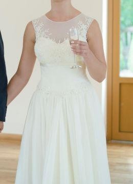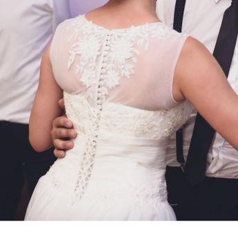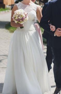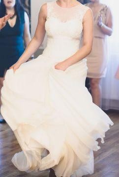 Witam, sprzedam suknię ślubną w kolorze ivory (śmietankowym). Suknia została dopasowana na osobę o rozmiarze 38, jednak dzięki wszytemu gorsetowi na plecach (od połowy sznurowany, górna część pleców zapinana na guziczki), powinna również pasować na kobietę noszącą rozmiar 36.
