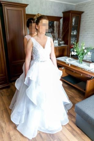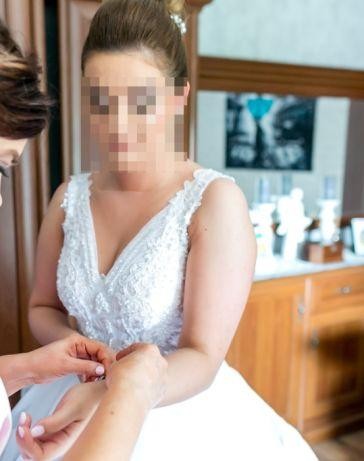 Suknie ślubną szytą w Salonie Pani Ewy Kwaśniewskiej w Pleszewie w 2018 roku.