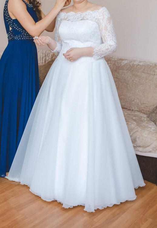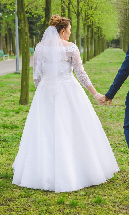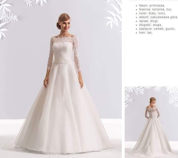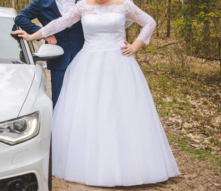 Sprzedam sukienkę:) kolor biały, góra zabudowana w łódkę odkryte ramiona, rękaw 3/4, bez trenu, zapięcie na guziki i zamek. Do sukienki dodam welon z koralikami :)