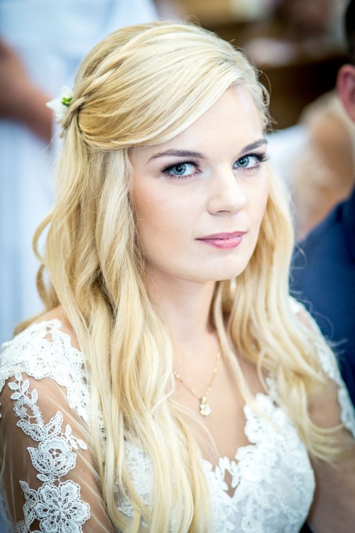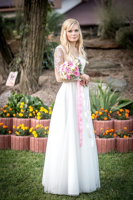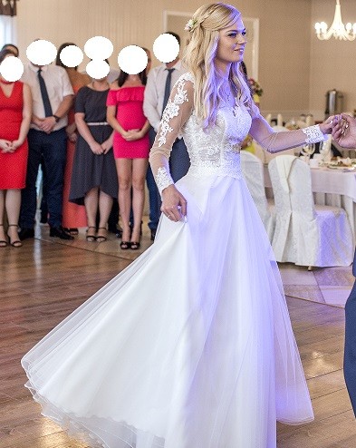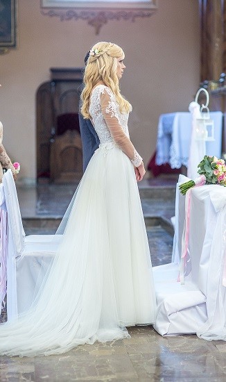 Przepiękna suknia ślubna z tiulowym gładkim dołem. Rękawy wykończone koronką.