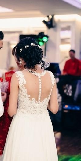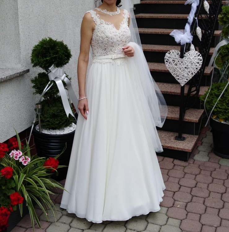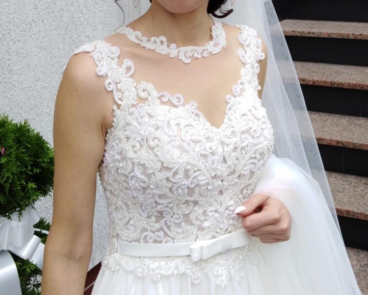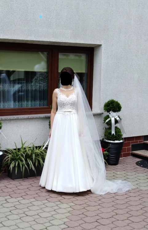 Sprzedam bardzo piękną suknię ślubną, szytą na miarę, rozmiar 34/36. Sukienka uszyta na wzrost 165 + obcas 5 cm. Kupiona w salonie sukien ślubnych w Krakowie. Kolor sukni to śmietanka. Suknia posiada gorset zapinany na guziczki, dzięki czemu idealnie dopasuje się do figury. Gorset bogato ozdobiony koronką oraz wyszywany perełkami. Sukienka zachwyciła wszystkich. Suknia składa się z kilku warstw muślinu, które pięknie układają się w tańcu. Dodatkowo do sukni jest dołączone koło, które można wyjąć. Sukienka jest w w bardzo dobrym stanie bez żadnych zniszczeń i uszkodzeń. Sukienka jest wyczyszczona gotowa do założenia. Dodatkowo dołączam welon o długości ok. 2 metry.