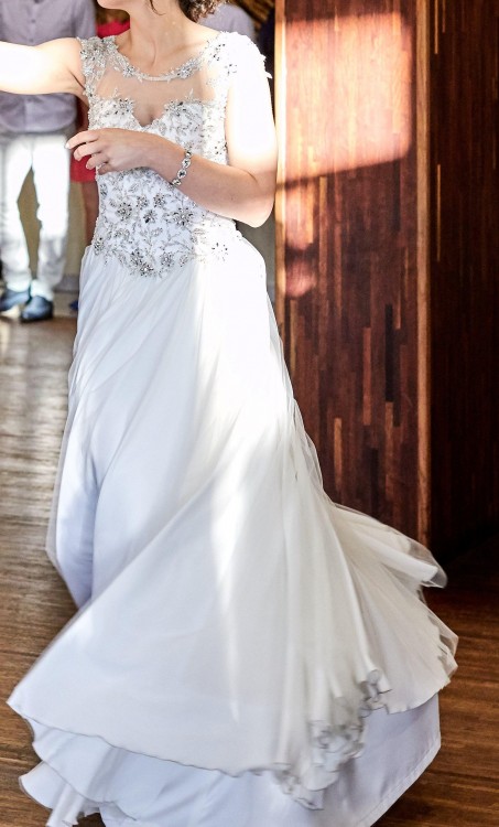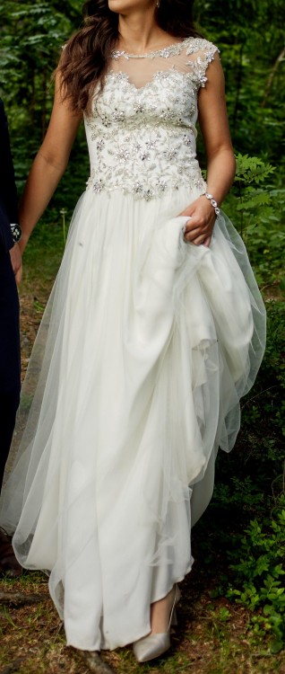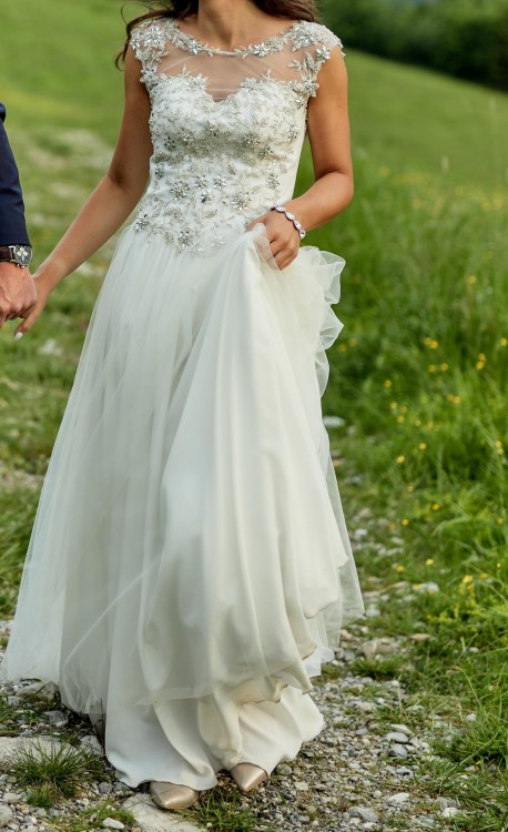Witam:) Sprzedam suknię ślubną w rozmiarze 34/36 uszytą przez markę KOMA. Cena sukni to 1500zł. Była uszyta na 162+ 7cm obcas. Suknia jest wygodna i zwiewna. Góra jest wykonana z aplikacji ręcznie wyszywanych, a dól to jedwabny muślin+ 1 warstwa tiulu. Suknia jest pięknie wycięta na plecach. Wszystkim zainteresowanym wyślę więcej zdjęc na priv.