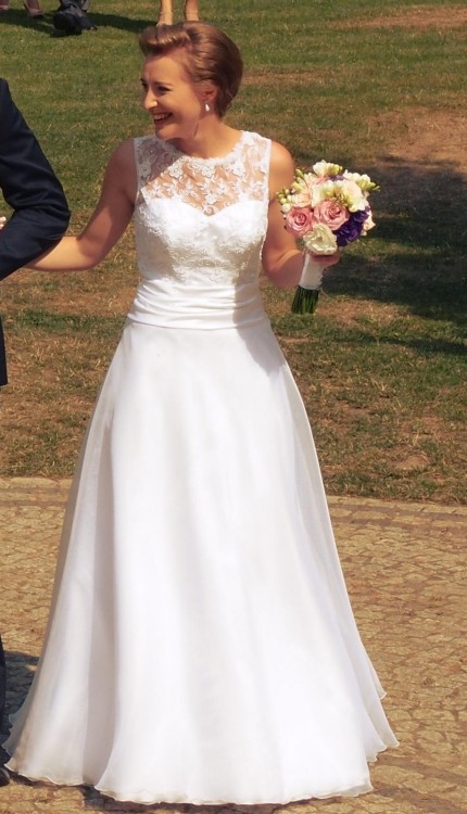 Mam do sprzedania piękną, delikatną suknie ślubną w kolorze białym. Rozmiar 34/36. Suknia była szyta na miarę. Idealna przy wzroście 163 cm + 6 cm obcas. Nadaje się również dla niższej panny młodej - można ją bez problemu skrócić. Suknia jest bardzo wygodna, nie krępuje ruchów.