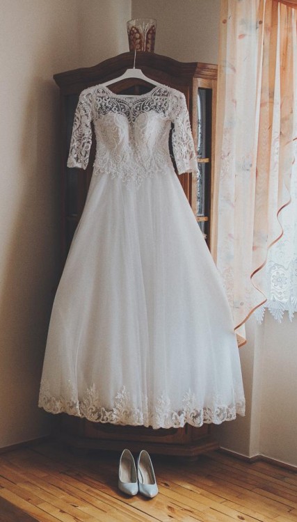 Witam, mam na sprzedaż przepiękną suknię ślubną typu princeska. Niepowtarzalny urok sukience dodaje bogato zdobiona góra koronką, a także rekaw.