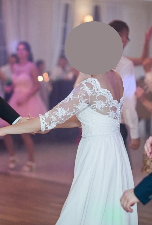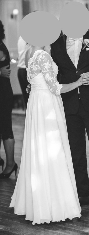 Przepiękna suknia ślubna z rękawkiem 3/4 szyta na wymiar. Sukienka w kolorze ivory, bardzo wygodna.